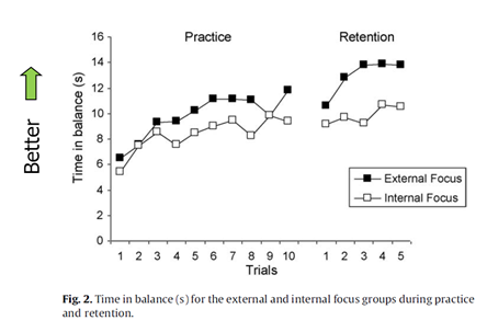 Bei einer gekonnten Bewegung oder einer Fertigkeit ist es immer vorteilhaft, sich auf die externen Konsequenzen der Handlung zu konzentrieren, und nicht auf die intern dafür notwendige Bewegungsausführung. Externer Fokus unterstützt die Ausführung automatisierter Bewegungen, die während der Bewegungsausführung nicht mehr der bewussten Bewegungskontrolle unterliegen. Interner Fokus scheint hingegen nur dann als sinnvoll, wenn eine Bewegung entweder noch nicht gelernt und automatisiert wurde, oder wenn Gefahr droht.